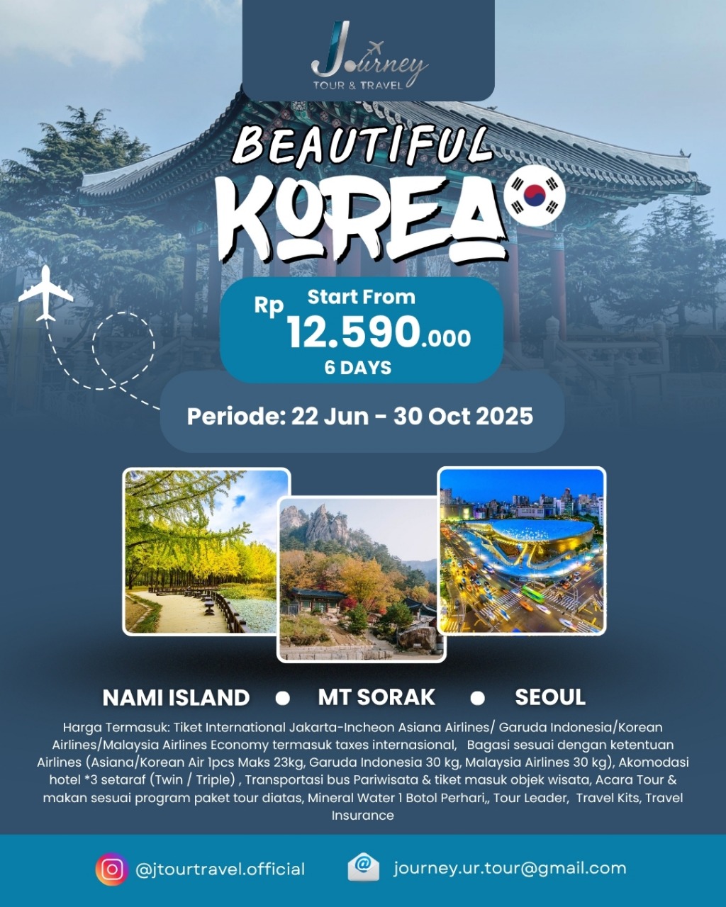 Paket wisata ini dirancang khusus untuk Anda yang ingin menjelajahi keindahan Korea Selatan dengan nyaman, aman, dan penuh kenangan.